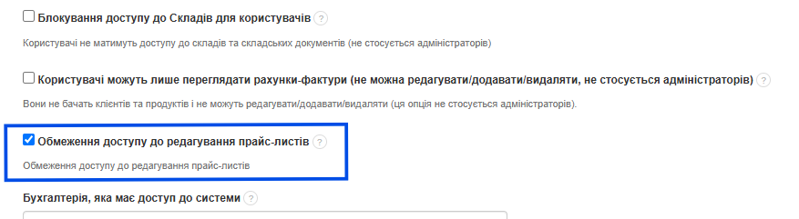 Якщо під час додавання Користувача або Бухгалтера до акаунта ви не хочете, щоб вони мали доступ до прайс-листів на товари, активуйте обмеження в системі, яке заборонить їм переглядати ці дані.