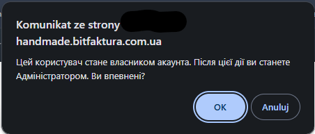 - підтвердьте повідомлення, що з'явиться в системі, натиснувши OK – пам’ятайте, що після зміни власника до вашої електронної адреси буде призначена роль Адміністратора акаунта;