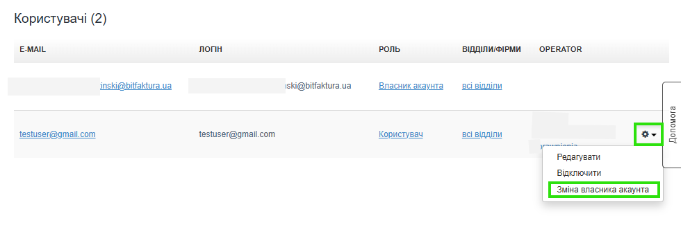 - натисніть на іконку шестірні поруч із вибраною електронною адресою та оберіть опцію Зміна власника акаунта;