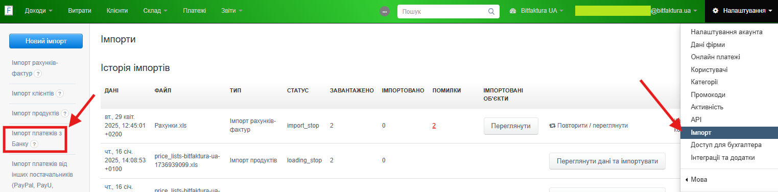 Щоб скористатися імпортом платежів, перейдіть у своєму акаунті до закладки Налаштування > Імпорт > Імпорт платежів з банку.