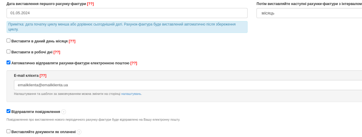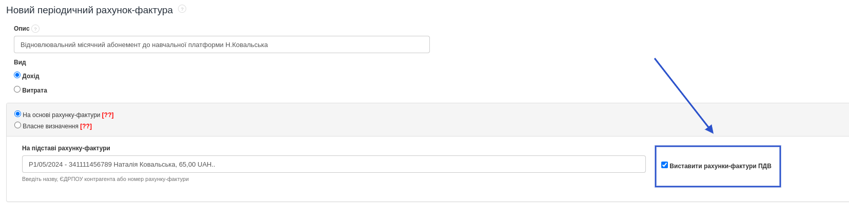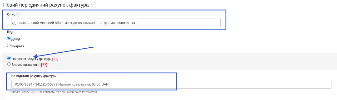 Якщо базовий документ вже створено під вашим акаунтом, перейдіть до закладки Доходи > Періодичні рахунки-фактури > Новий періодичний рахунок-фактура, щоб на його основі створити цикл.  У формі для створення періодичного рахунка-фактури заповніть Опис і виберіть опцію На основі рахунка-фактури.  У полі На основі рахунка-фактури виберіть базовий документ зі списку, ввівши ім’я, ІПН контрагента або номер рахунка-фактури. Якщо підставою є небухгалтерський документ, то біля поля На підставі рахунка-фактури з’явиться опція Виставити рахунки-фактури ПДВ. Якщо ви хочете, щоб система виставляла рахунки-фактури ПДВ одразу, то виберіть цю опцію. Невикористання цієї опції призведе до того, що система виставлятиме той самий тип необлікового документа, що й базовий документ. Завершіть налаштування циклу, що залишилися. Виберіть дату виставлення першого рахунка-фактури та періодичність їх виставлення. Скористайтеся опцією автоматичної відправки рахунка електронною поштою, якщо хочете, щоб система відправляла документ відразу після його виставлення. Ви також можете надсилати повідомлення на свою адресу електронної пошти, коли буде виставлено новий рахунок у циклі. Після налаштування всіх параметрів підтвердіть створення циклу кнопкою Зберегти. Система відобразить підсумок налаштувань створеного циклу. Якщо цикл виставить документ, то як наслідок з’явиться запис Виставлені рахунки-фактури, де буде видно номер виставленого документа, натискання на який переведе вас до його попереднього перегляду. Створення циклу на основі документа також доступне безпосередньо з рівня попереднього перегляду виставленого рахунка-фактури. У контекстному меню над документом виберіть Більше опцій > Встановити періодичний. Номер документа буде автоматично введений у спеціальному полі. Налаштуйте решту параметрів циклу.