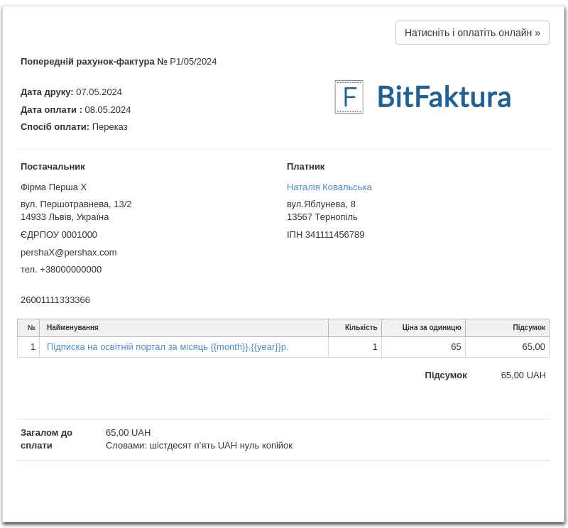 Щоб створити цикл на основі рахунка-фактури, спочатку виставте базовий документ, з якого система скопіює дані 1:1 у документи, що будуть виставлятися періодично. У нашому прикладі ми виставимо рахунок-проформу як базовий документ. Це небухгалтерський документ, тому, якщо виникне необхідність змінити дані під час циклу, це не потребуватиме вимкнення циклу та його повторного створення. Не слід редагувати дані на бухгалтерських документах, які вже надійшли в господарський обіг.  Продукт, який ми будемо продавати, — це місячна підписка на доступ до платформи онлайн навчання. Рахунки-фактури виставлятимуться щомісяця на той самий продукт і суму.  Щоб підготувати базовий документ, перейдіть до закладки Доходи > Рахунок-Проформа > Додати. Ми заповнюємо реквізити Покупця, позиції в рахунку та інші налаштування, такі як форма та дата оплати, і підтверджуємо їх за допомогою кнопки Зберегти.  У нашому прикладі ми використали змінні в назві позиції рахунка-фактури. Завдяки їм система автоматично вставлятиме місяць і рік, за який буде сплачена передплата для наступних створених документів. Ви можете прочитати більше про змінні в назві позиції рахунка-фактури для періодичних рахунків-фактур у цій статті → Як ввести змінні в назву позиції в рахунках-фактурах, створених циклом?
