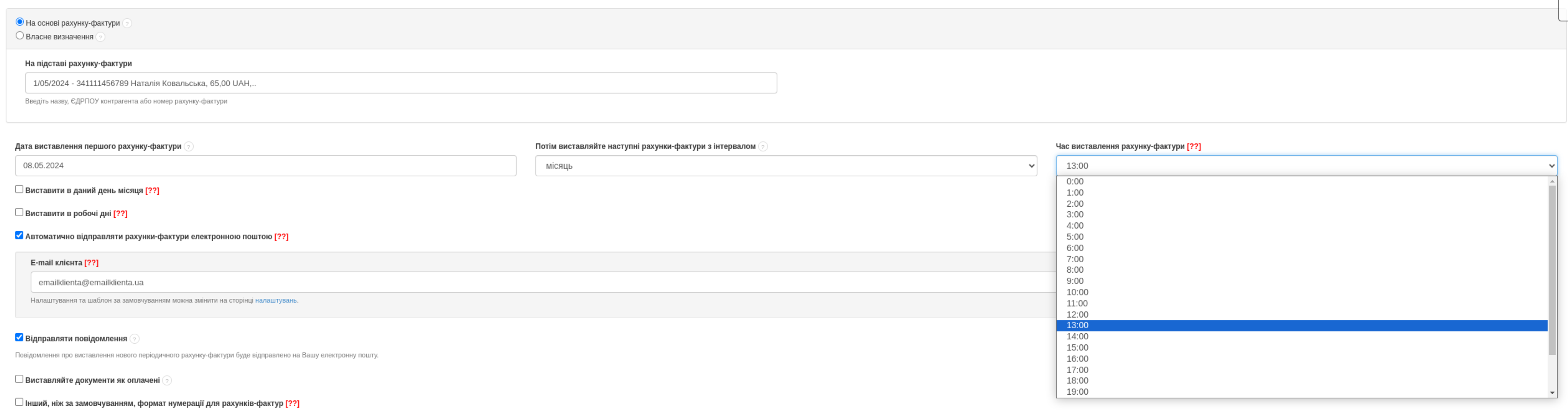- в полі Час виставлення рахунку-фактури виберіть один з доступних варіантів,