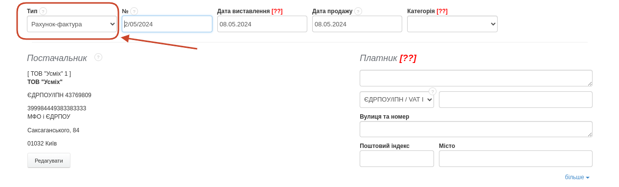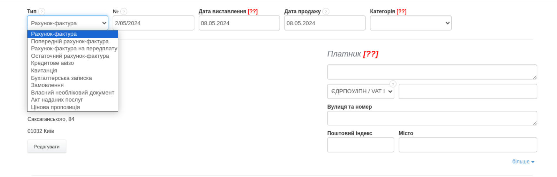 - натискання на це поле дозволяє змінити тип документа, вибравши його з відображеного списку (у списку будуть документи, які активні в розділі Які документи виставляти).