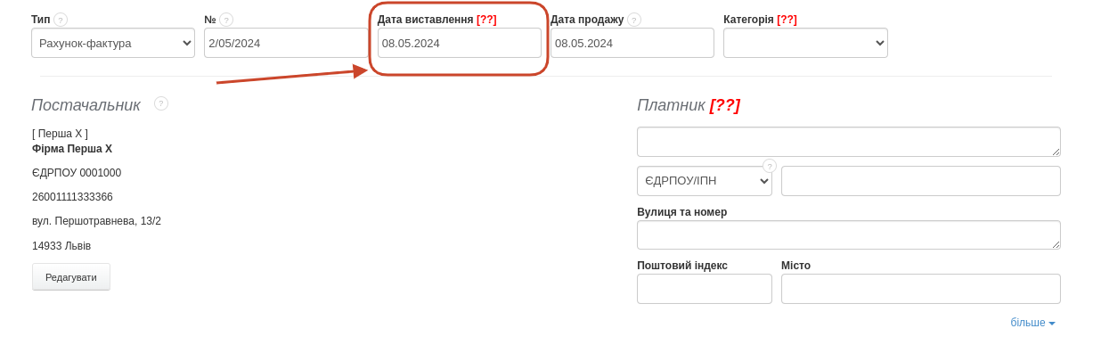 Дата виставлення поруч із номером документа є основним елементом правильно оформленого рахунка-фактури. Вона призначається системою автоматично, відповідно до дати створення рахунка-фактури, але її також можна редагувати та задавати вручну. З цієї статті ви дізнаєтесь, де у формі створення документа доступне поле дати виставлення, на що воно впливає та як вручну змінити цю дату.