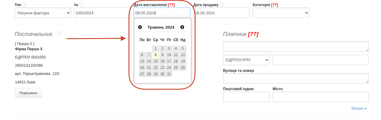 Ви можете змінити дату виставлення вручну. Просто натисніть на розділ Дата виставлення під час створення або редагування документа. Система відобразить календар, за допомогою якого можна вибрати дату, яка має бути видимою в документі.  Зміна дати виставлення впливає також на зміну дати продажу. Однак дата продажу не обов’язково має збігатися з датою виставлення. Щоб змінити дату продажу, як і у випадку з датою виставлення, клацніть на відповідному полі та виберіть рік, місяць і день за допомогою відображеного календаря.  Ознайомтеся також: