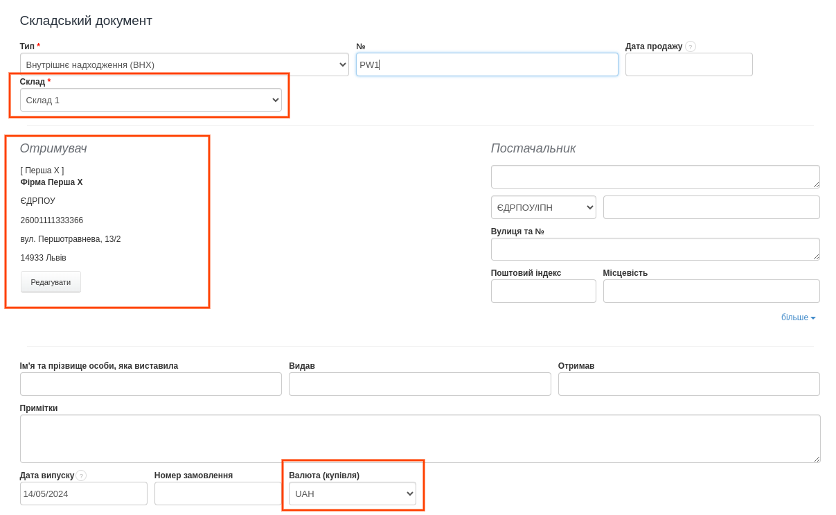 - виберіть Склад, в якому має бути отриманий товар;