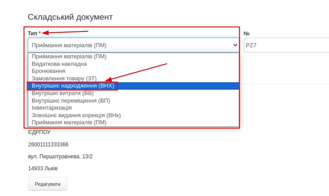 - у полі Тип у формі виберіть Внутрішнє ннадходження (ВНХ);