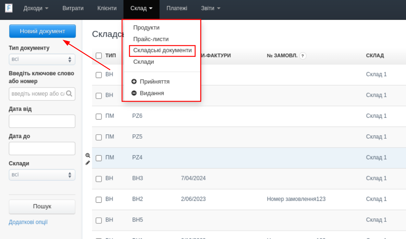 - перейти до закладки Склад і вибрати зі списку Складські документи;