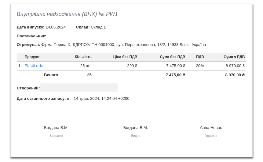 BitFaktura дозволяє керувати складом і запасами продуктів за допомогою складських документів. Одним із документів, який ви можете використовувати при управлінні своїм складом, є документ ВНХ, тобто внутрішнє надходження.