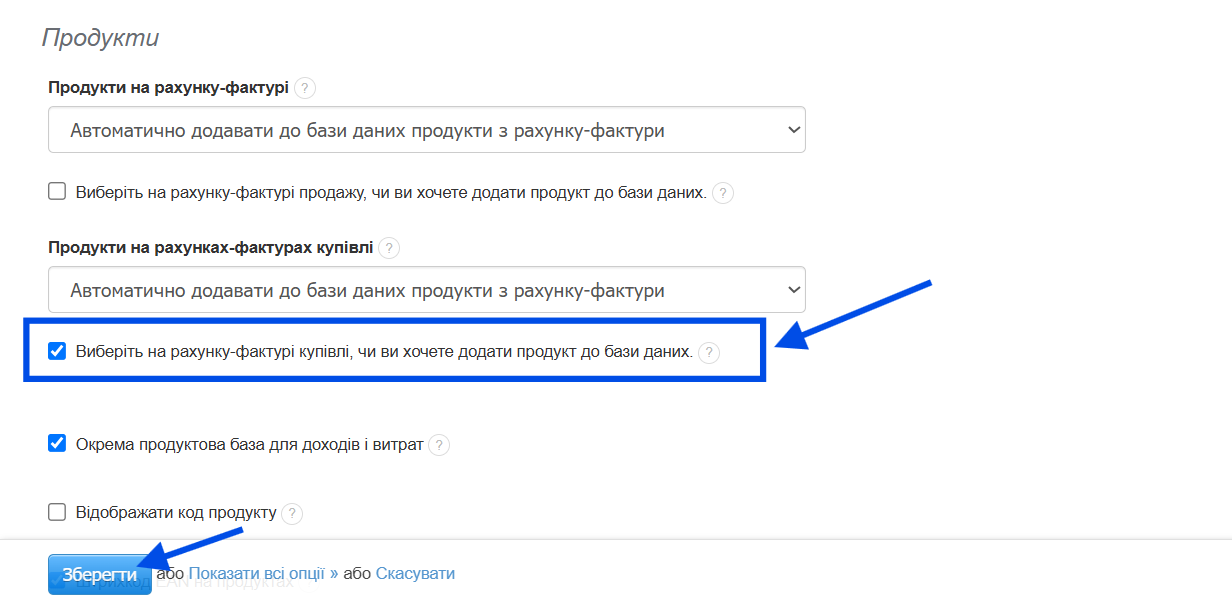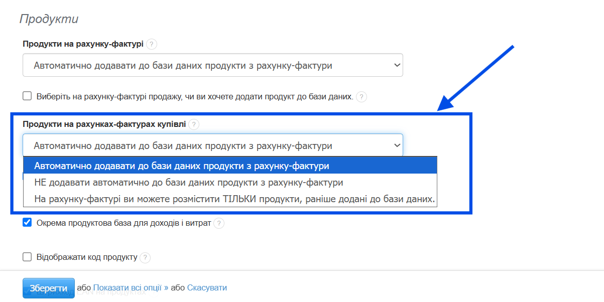- натисніть і виберіть опцію «Автоматично додавати до бази даних продукти з рахунку-фактури», якщо хочете, щоб після збереження витрати товари автоматично з’явилися у вашій базі;