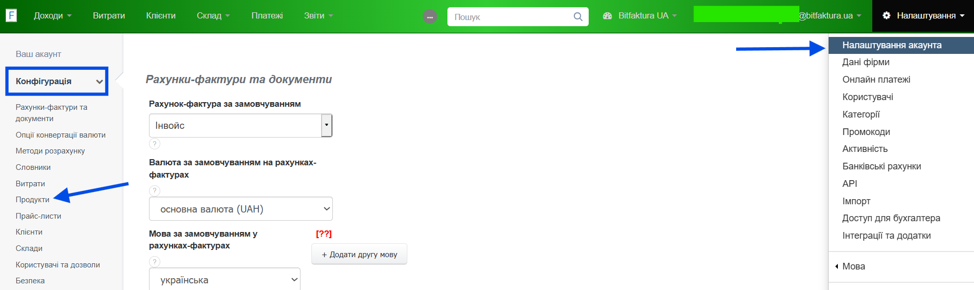 Перед додаванням продуктів на склад за допомогою документів ПМ ми можемо легко визначити спосіб, у який продукти додаватимуться до бази продуктів у вашому акаунті. Щоб активувати автоматичне додавання продуктів до бази з закупівельних рахунків-фактур:- перейдіть до меню Налаштування > Налаштування акаунта > Конфігурація > Продукти;