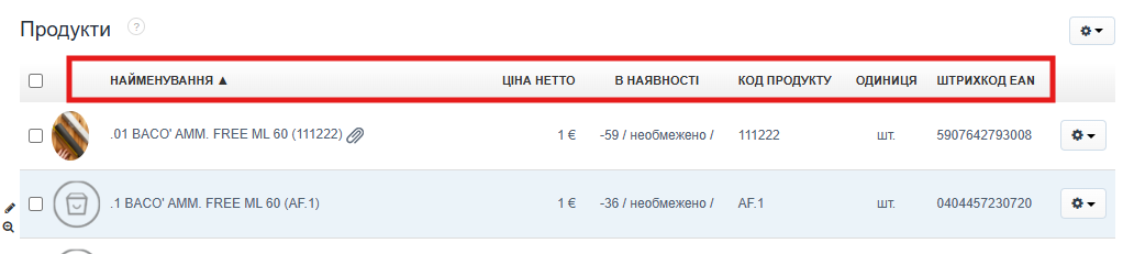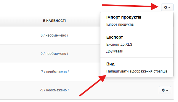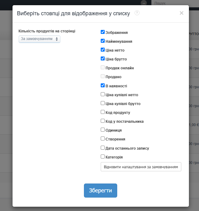 Налаштування відображення стовпців у списку продуктів