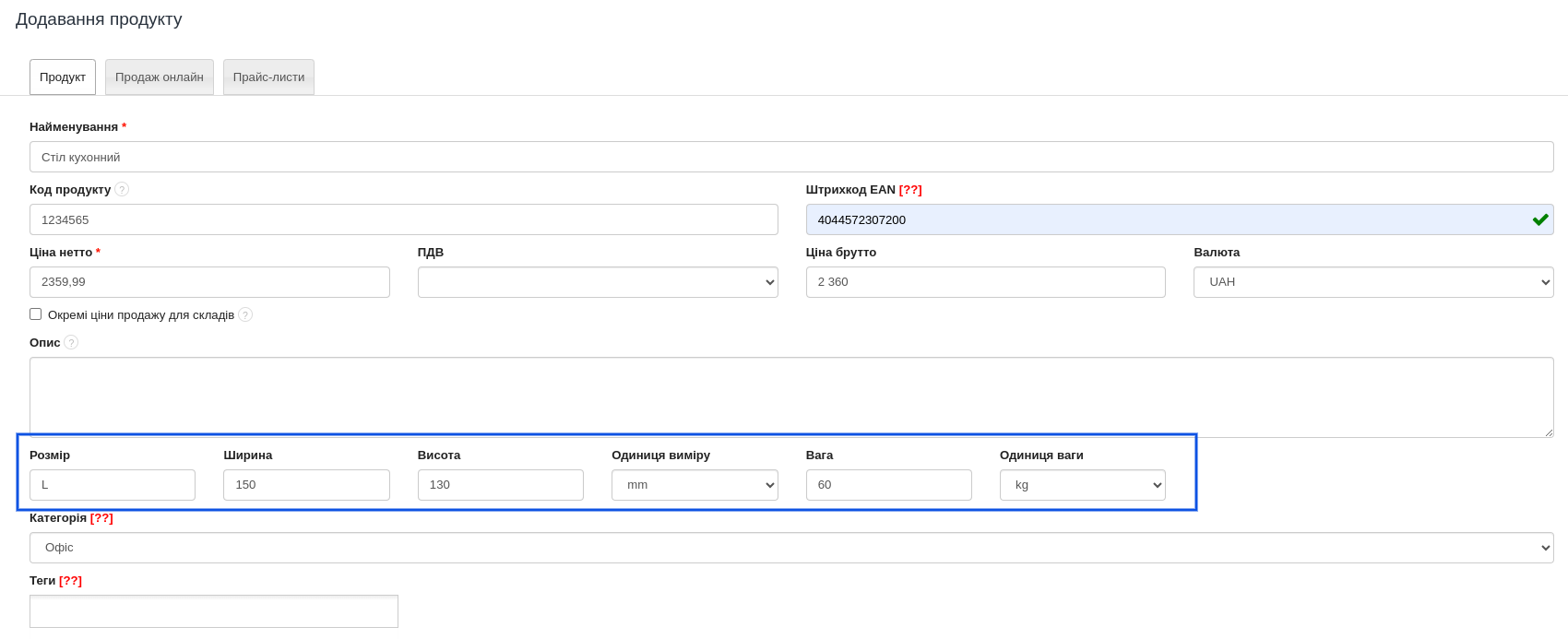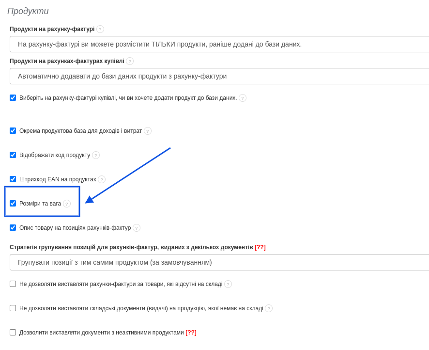 BitFaktura пропонує широкий складово-продуктовий модуль, до якого ви можете додавати інформацію про продукти, які ви продаєте. Однією з інформацій, яку ви можете включити в систему, є розмір і вага ваших продуктів. Щоб додати цю інформацію, спочатку перейдіть до меню Налаштування > Налаштування акаунта > Конфігурація > Продукти та виберіть опцію Розміри та вага. Після вибору вищезазначеної опції ви побачите на картці продукту поля для заповнення, завдяки яким ви надасте інформацію про розмір і вагу продукту: