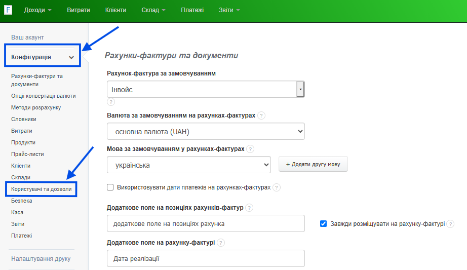 Щоб запобігти будь-яким змінам у документах або їх видаленню після надсилання контрагенту, ви можете скористатися функцією блокування редагування та видалення рахунку-фактури після його відправлення. Щоб увімкнути це блокування:- перейдіть до закладки Налаштування > Налаштування акаунта > Конфігурація > Користувачі та дозволи,