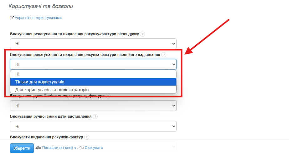 - натисніть поле Блокування редагування та видалення рахунку після його надсилання і виберіть один із доступних варіантів: лише для користувачів або для користувачів і адміністраторів — за замовчуванням в акаунті це блокування вимкнене,