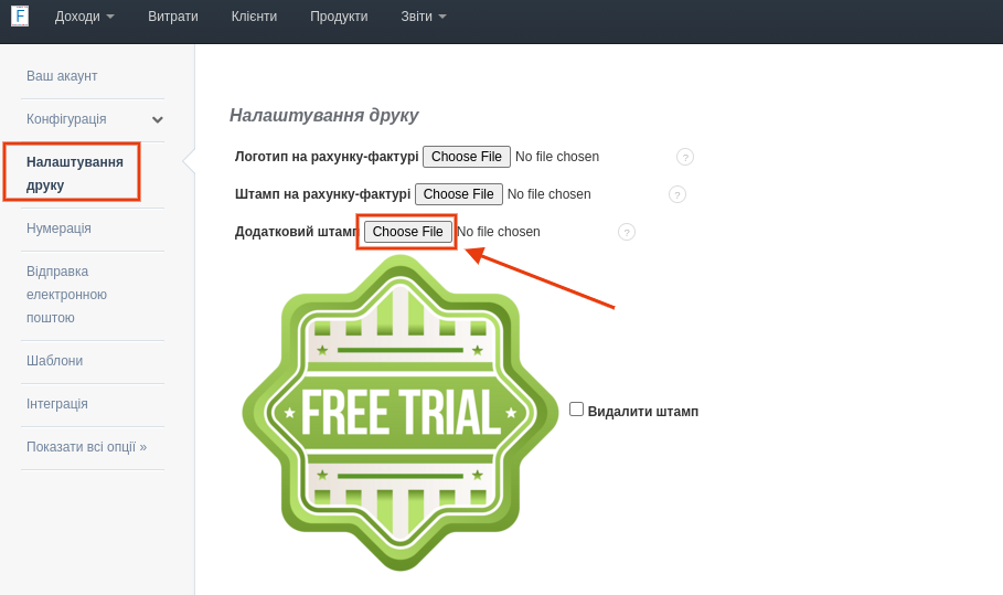 Щоб завантажити додатковий штамп на рахунок-фактуру: .- перейдіть до закладки Налаштування > Налаштування акаунта > Налаштування друку,