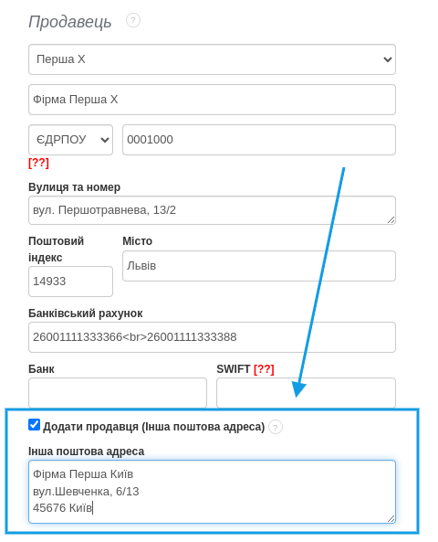 Щоб додати іншу адресу для листування в даних Продавця: .- перейдіть до форми створення рахунка-фактури,