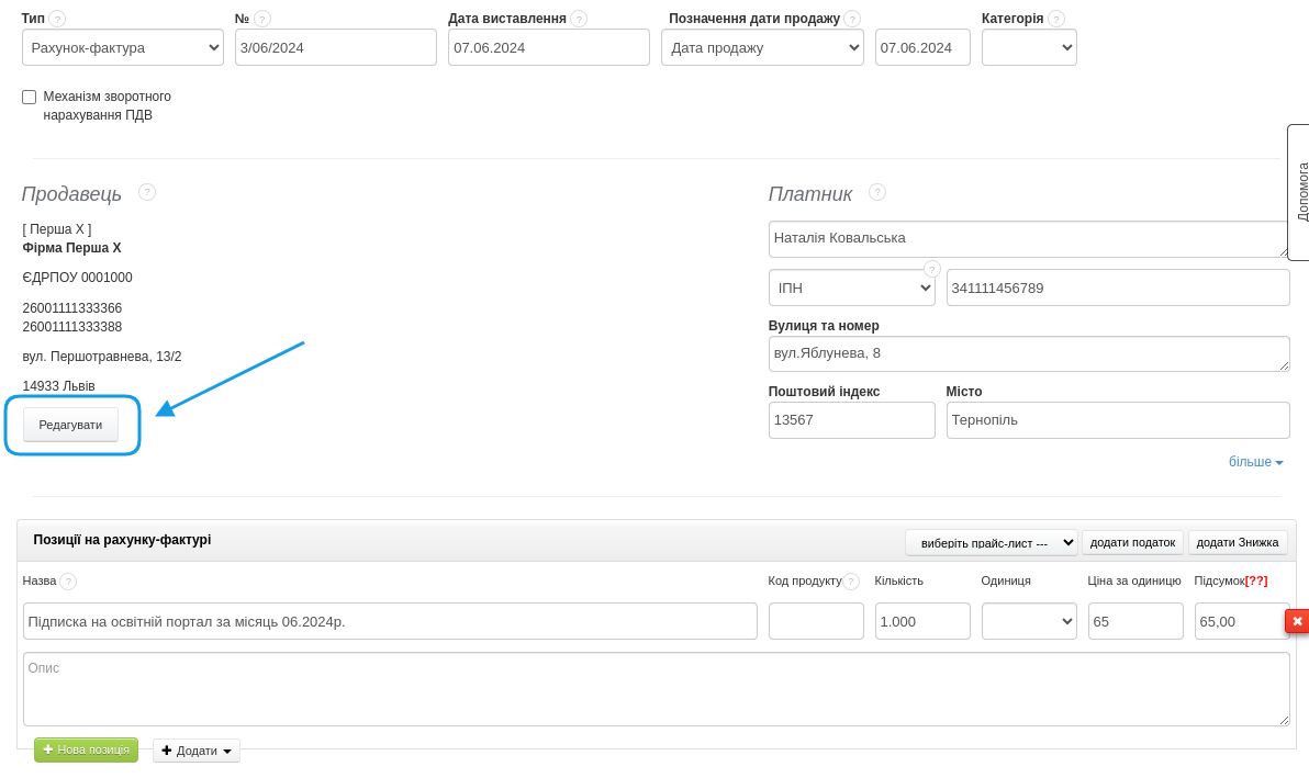 - в розділі Продавця натисніть кнопку Редагувати, щоб активувати редагування даних,