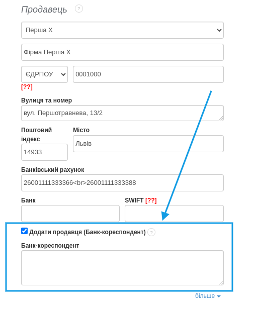 - Тоді розділ Продавця при створенні документа виглядатиме так: