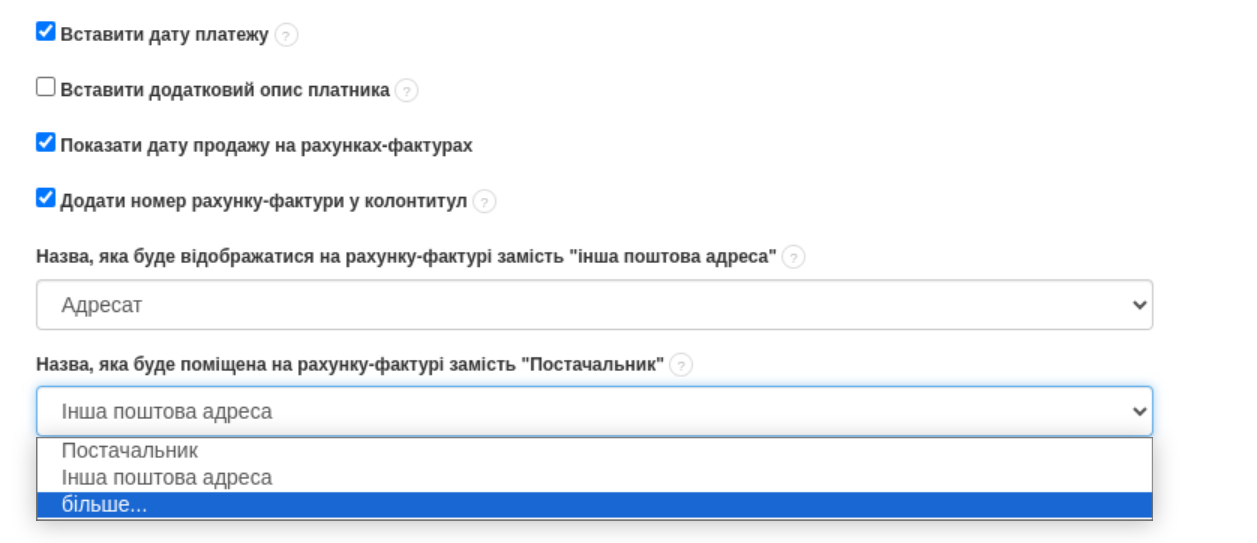 - Назва, яка відображається в рахунку-фактурі замість «Інша поштова адреса» на стороні Покупця
