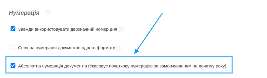 У BitFaktura ви можете впливати на спосіб нумерації ваших документів. Одним із варіантів нумерації, який ви можете налаштувати в системі, є можливість підтримувати абсолютну безперервність нумерації, тобто на початку нового року нумерація не буде починатися з номера 1, а триватиме. Як це виглядає на практиці? Якщо рахунок-фактура, виставлений в останній день минулого року, має номер 234, то перший рахунок-фактура, виставлений у новому році, матиме номер 235. Ця функція особливо корисна, якщо ви не включаєте рік "yyyy" у формат нумерації - це запобіжить дублюванню рахунків-фактур. Щоб налаштувати описану опцію у своєму акаунті, перейдіть в меню Налаштування > Налаштування акаунта > Нумерація і виберіть опцію Абсолютна нумерація документів: Увага: Абсолютна нумерація не працюватиме у форматах нумерації, які використовують щоденну нумерацію "nr-d" або щомісячну нумерацію "nr-m".