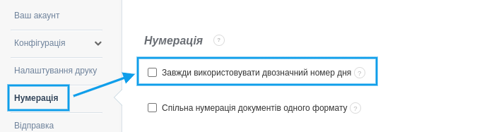 Для активації введення двозначного запису дня: .- перейдіть до закладки Налаштування > Налаштування акаунта > Нумерація,