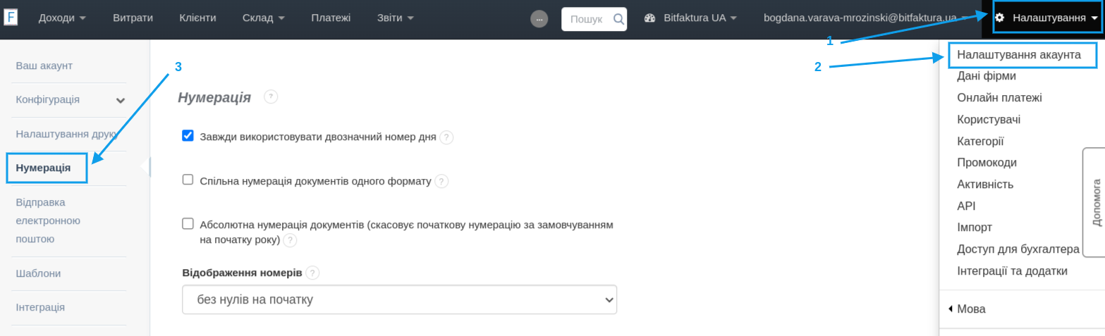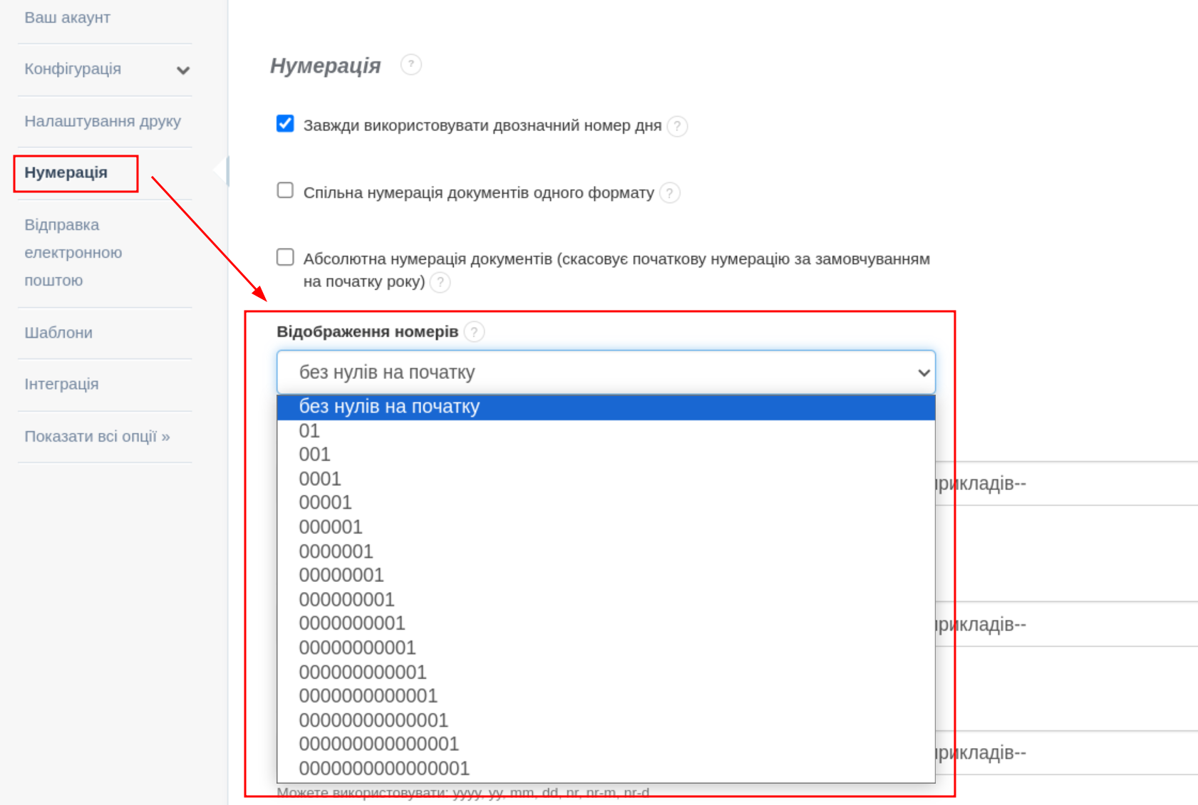 Щоб додати нулі на початку відображених номерів: .- перейдіть до закладки Налаштування > Налаштування акаунта > Нумерація,