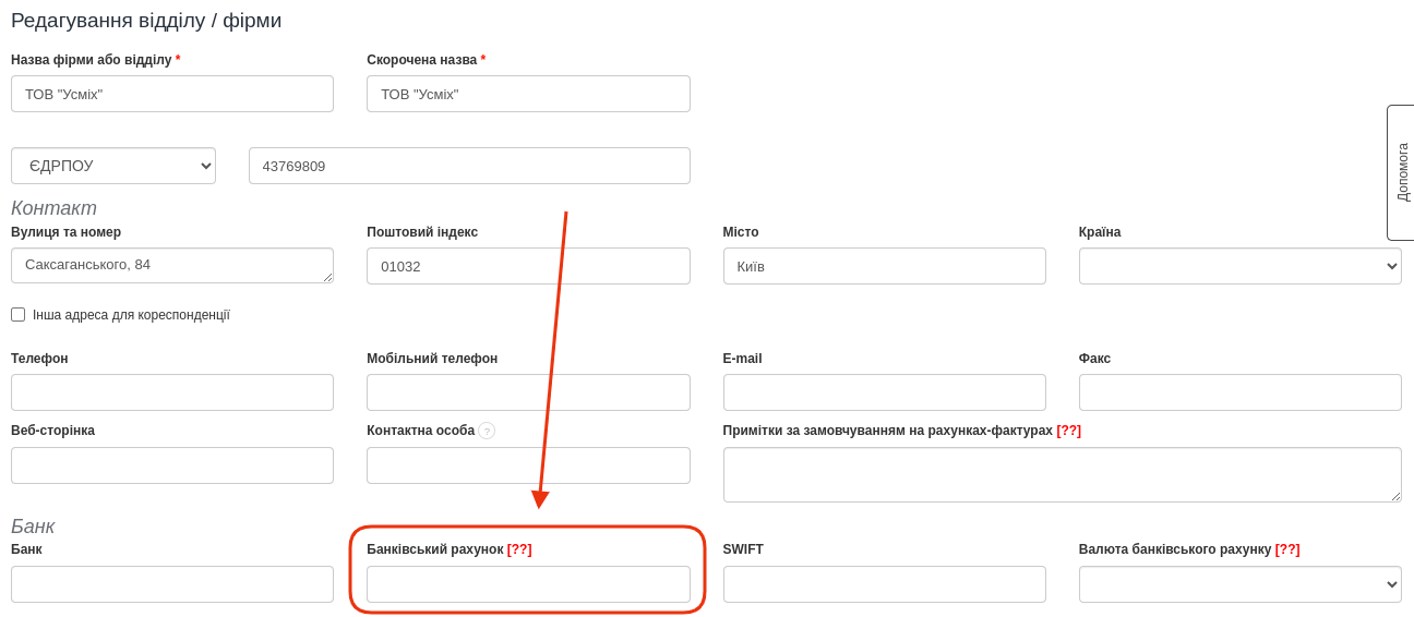 Якщо у вашому акаунті є кілька відділів і той, який ви вибрали для виставлення рахунка-фактури, має певну валюту в меню Налаштування > Дані компанії в полі Валюта банківського рахунку, то це валюта за умовчанням, яка автоматично відображатиметься в рахунку-фактурі. Щоб змінити це, відредагуйте відділ і в полі Валюта банківського рахунку змініть валюту на UAH або залиште поле Валюта банківського рахунку порожнім, тоді система використовуватиме валюту, встановлену в налаштуваннях акаунта Налаштування > Налаштування акаунта. Якщо, незважаючи на ці зміни, валюта все ще вказується як EUR, тоді перевірте Налаштування > Налаштування акаунта > Конфігурація > Рахунки-фактури та документи > Валюта > Валюта на рахунках-фактурах за умовчанням