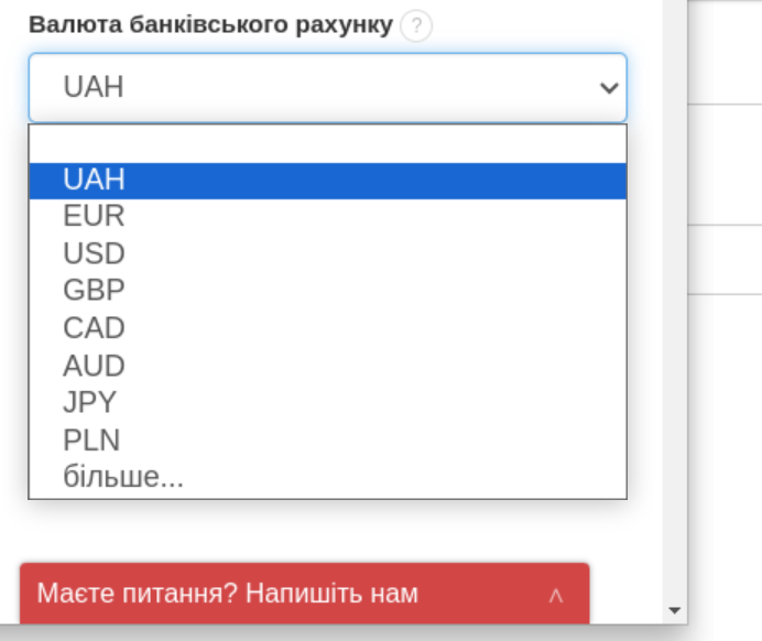 У BitFaktura ви можете встановити валюту банківського рахунку для вашої фірми або додаткового відділу, створеного в рамках фірми.  Ви можете вказати номер банківського рахунку та його валюту при створенні / редагуванні відділу.  Якщо ви щойно додали акаунт у системі, вам необхідно вказати інформацію про свою фірму. Ви можете зробити це через Налаштування > Дані фірми. Там також можна редагувати дані, додані раніше. У формі відділу ви можете внести необхідну інформацію. Всі питання, пов'язані з номером рахунку, його валютою та назвою банку, ви можете заповнити у розділі Банк У полі Банк ви можете додати назву свого банка. У полі Банківський рахунок вкажіть номер свого рахунку, який буде відображений на рахунку-фактурі. Код SWIFT — це ідентифікаційний код установи, який можна знайти на сайті вашого банка. Поле Валюта банківського рахунку дозволяє визначити валюту вашого рахунку в банку. У цьому полі ви можете вибрати валюту зі спадного списку. Список містить найпопулярніші валюти, такі як EUR, PLN, USD, GBP тощо. Опція більше дозволяє розширити перелік валют, доступних для вибору. Ознайомтеся також: Основна валюта вашого акаунта, валюта рахунку за замовчуванням та валюта вашого банківського рахунку Ознайомтеся також: Як додати більше номерів рахунків до рахунка-фактури