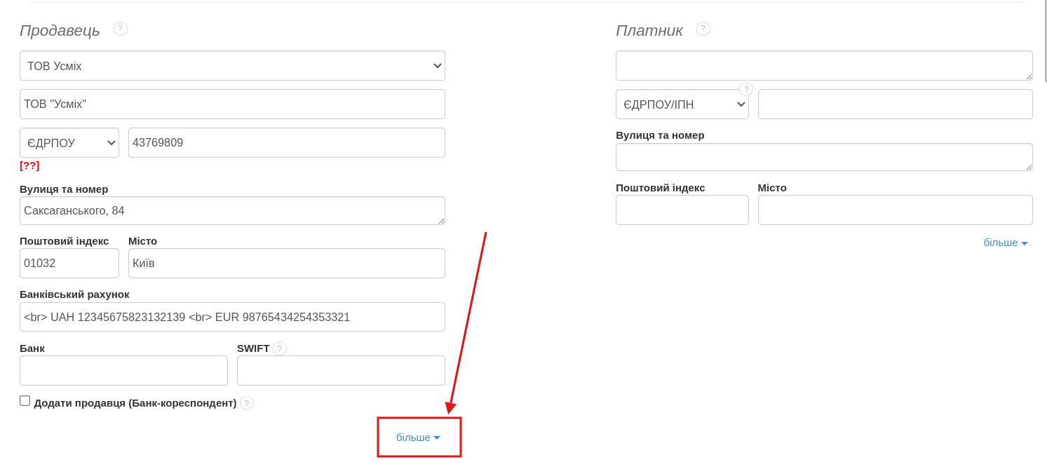 - в розділі Продавця натисніть на слово більше,