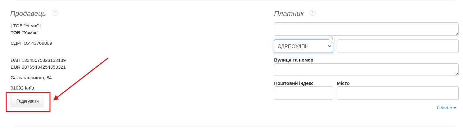 - натисніть кнопку Редагувати під даними Продавця і введіть нові дані у вибраних полях,