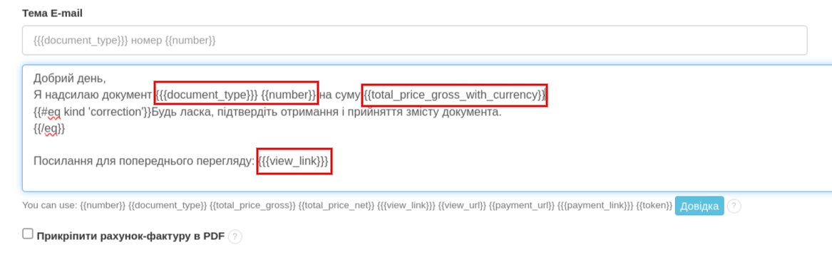 Ви можете налаштувати вміст повідомлення за допомогою змінних, одноразове використання яких дозволяє автоматично завантажувати дані з системи при кожній наступній відправці. Після створення універсального шаблону повідомлення, до якого ви додаєте імена змінних, і з кожним наступним надсиланням система завантажує певні дані, що відповідають документу або клієнту.