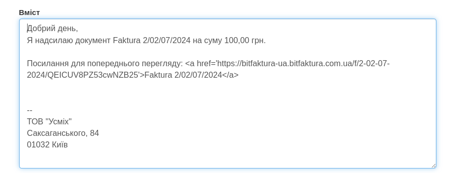 Вміст, який після відправлення листа бачить Підрядник, до якого ви надіслали повідомлення з рахунком-фактурою.