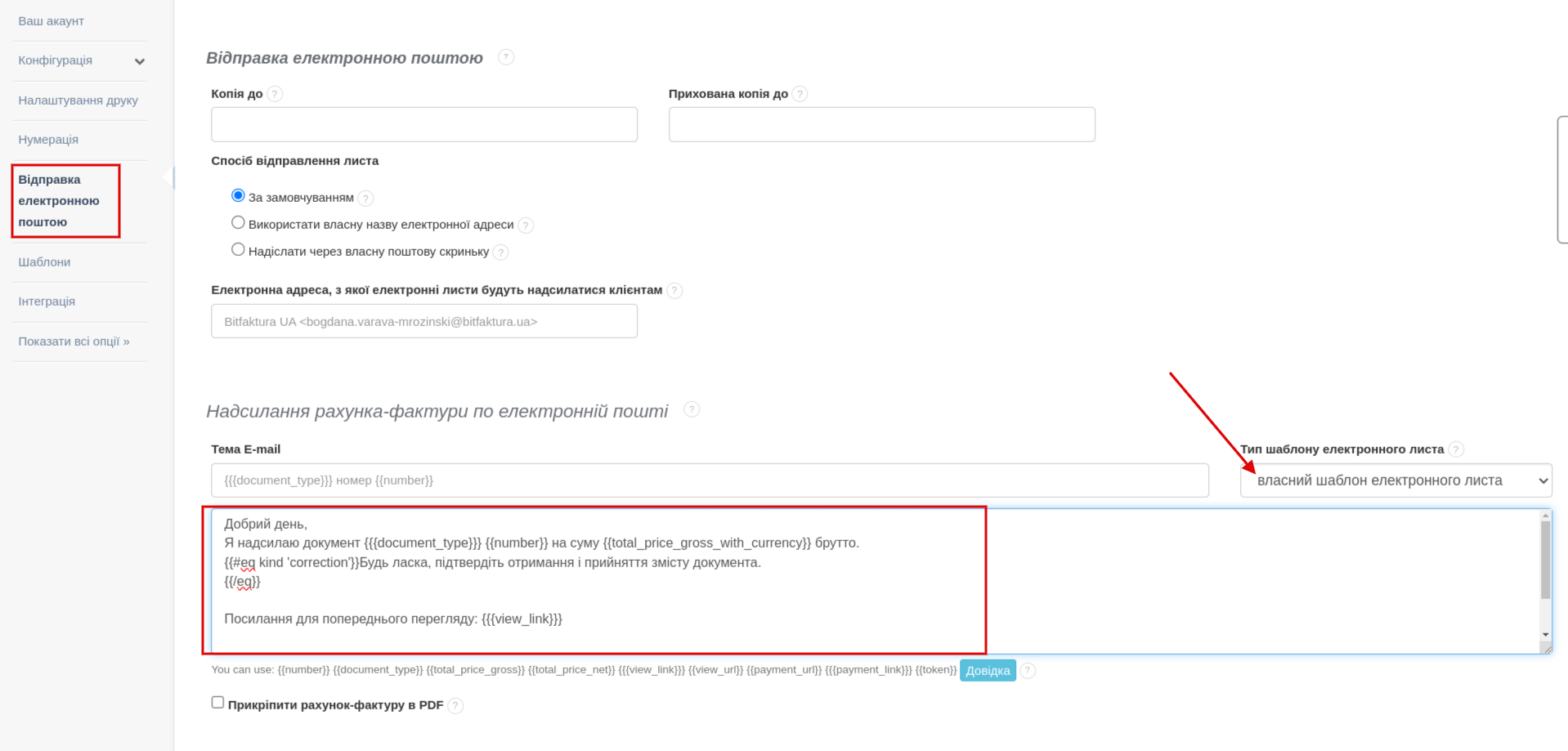 Ви можете налаштувати вміст надісланого повідомлення в меню Налаштування > Налаштування акаунта > Відправка електронною поштою для загальних налаштувань акаунта. Якщо ви хочете визначити вміст повідомлення для вибраного відділу, перейдіть на закладку Налаштування > Дані фірми > клацніть зубчасте колесо поруч із відділом та виберіть Редагувати > позначте чекбокс при опції Окремі налаштування відправки документів через e-mail. Детально про відправку документів електронною поштою ми описуємо тут.
