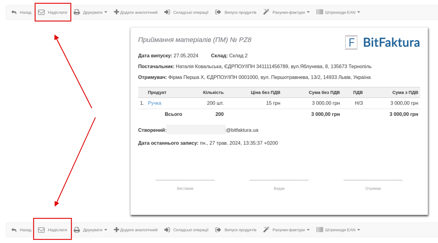 Форма для відправки складських документів в електронному листуванні активується з рівня попереднього перегляду складських документів. У верхньому меню натисніть Склад > Складські документи, а потім відкрийте документ, який потрібно надіслати. Виберіть опцію Надіслати у верхній/нижній панелі попереднього перегляду складського документа.