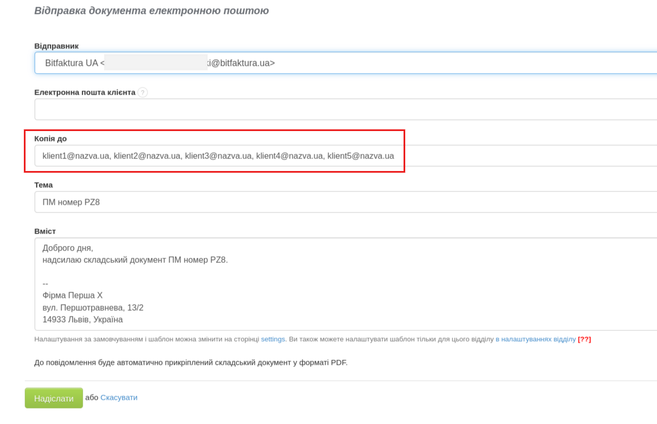 *УВАГА! Складський документ можна надіслати одночасно максимум 5 одержувачам, адреси електронної пошти яких мають бути вказані через коми.