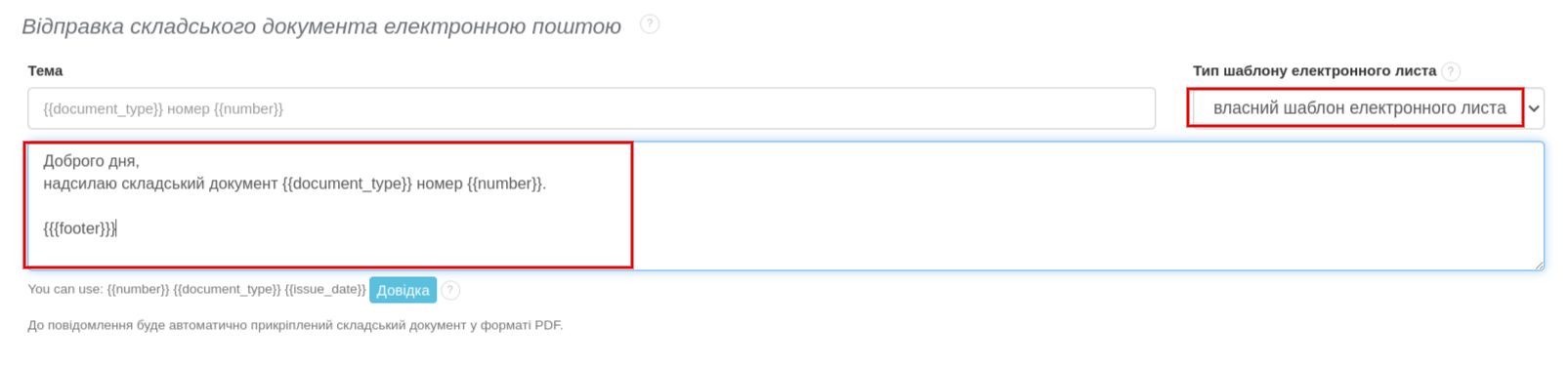 Щоб відредагувати вміст електронного листа в глобальних налаштуваннях акаунта, перейдіть до Налаштування > Налаштування акаунта > Відправка електронною поштою > розділ Відправка складського документа електронною поштою. Потім поруч із полем Тема змініть шаблон електронного листа за замовчуванням на власний шаблон електронного листа. Завдяки цій зміні розділ зі вмістом листа стає активним, і ви можете налаштувати власний вміст повідомлення. Підтвердьте зміни вмісту, натиснувши кнопку «Зберегти» внизу сторінки.Відправка складських документів електронною поштою