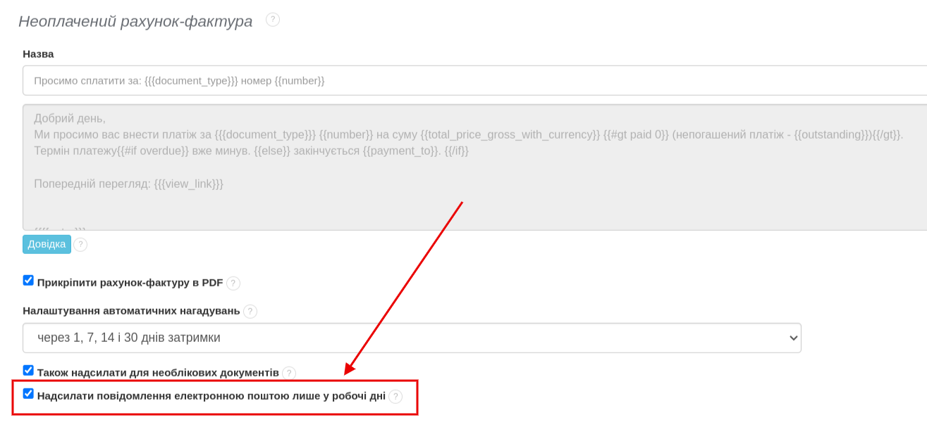 - знайдіть розділ Неоплачений рахунок-фактура і активуйте автоматичні нагадування, якщо ще не користуєтесь цією опцією, у полі Налаштування автоматичних нагадувань,