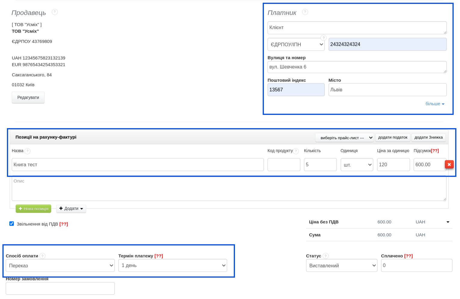 - у розділі "Платник" оберіть Контрагента (Клієнта), для якого ви хочете виставити рахунок, або додайте нового;
