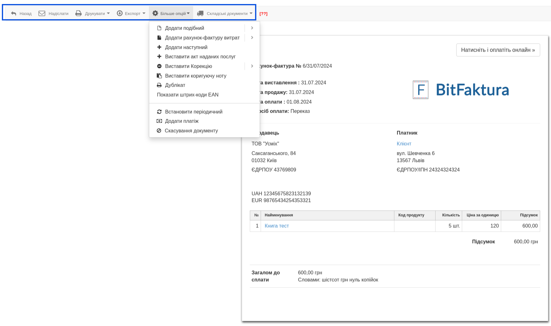 BitFaktura Micro дозволяє виставити 3 рахунки з датою виставлення в поточному місяці без жодних витрат. Якщо ви хочете виставляти більше ніж три рахунки на місяць або користуватися додатковими функціями, такими як інтеграція з бухгалтерією, складом, платежами, вам потрібно придбати один із платних планів. Деталі щодо них ви знайдете за адресою bitfaktura.com.ua/taryfy.