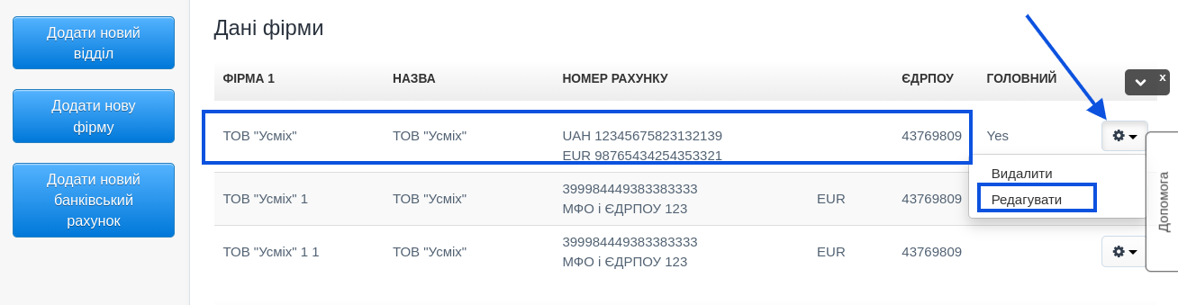 - у списку відділів клацніть назву відділу, який потрібно редагувати, або клацніть значок зубчастого колеса та виберіть Редагувати - система перенесе вас до форми редагування,
