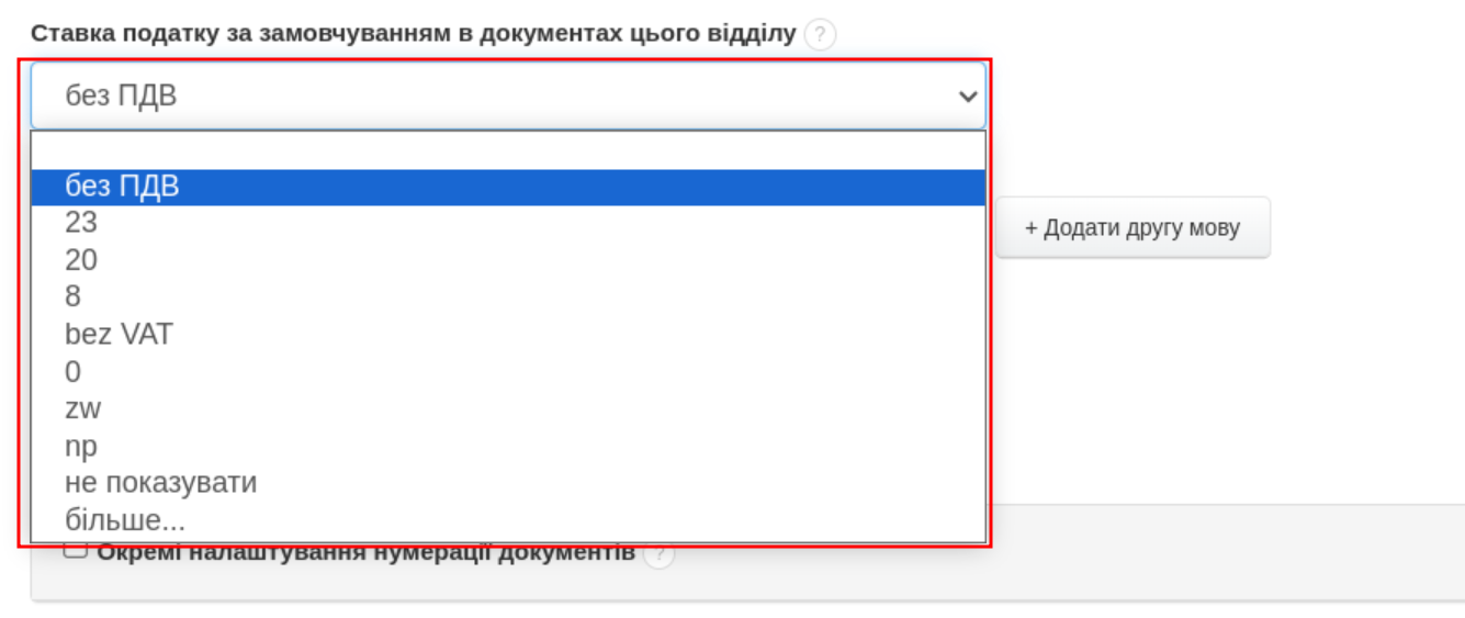 - у полі Ставка податку за замовчуванням в документах цього відділу ви можете вибрати одну із доступних ставок або додати свою власну за допомогою опцій більше...,
