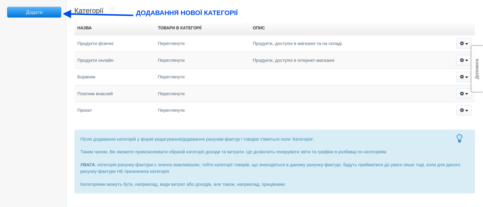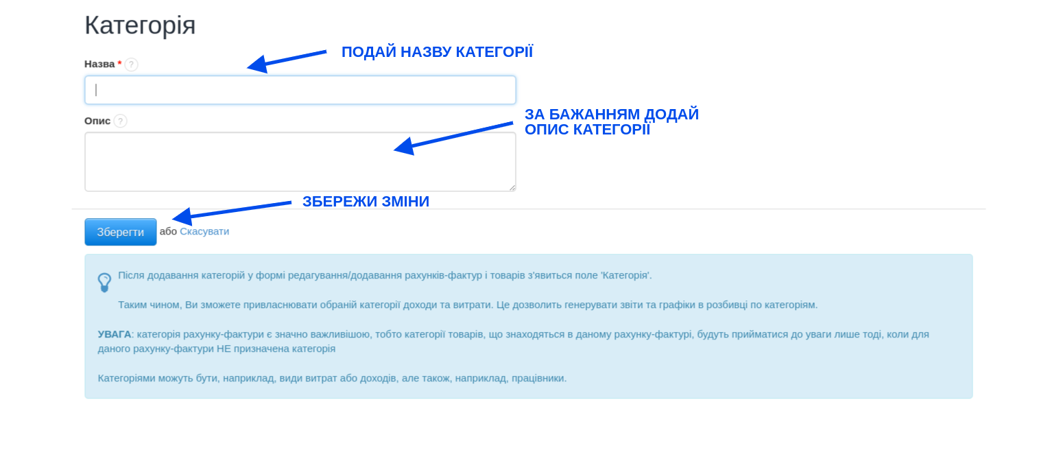 Додавання продуктів до відповідної категорії відбувається наступним чином. Ми починаємо зі створення відповідної категорії переходячи на закладку Налаштування > Категорії > Додати нову. Після натискання «Додати» встановіть назву для категорії, за бажанням додайте опис категорії та підтвердьте її створення, натиснувши «Зберегти». Потім перейдіть до закладки Склади > Продукти і додайте новий продукт або відредагуйте існуючий. Ми призначаємо категорії з картки товару, вибираючи її в розділі Категорія. Підтвердьте внесені зміни, натиснувши кнопку Зберегти. Відтепер продукт має призначену категорію. Дуже швидко ви можете знайти в списку продуктів в даному складі продукти, які призначені до певної категорії. Для цього достатньо використати фільтр "Категорія", що знаходиться в боковій панелі закладки "Продукти".