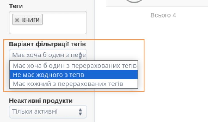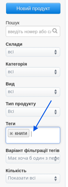 У списку продуктів, у панелі фільтрації, є можливість пошуку за певними тегами. Після початку введення в полі "Теги" програма пропонує вже існуючі записи. У цьому полі також можна додати новий тег — механізм працює так само, як на картці продукту.- (продукти) мають принаймні один із тегів,