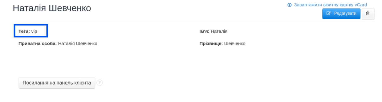 Коли ви створите теги та збережете дані клієнта, програма відобразить інформацію про використані теги на картці цього клієнта.