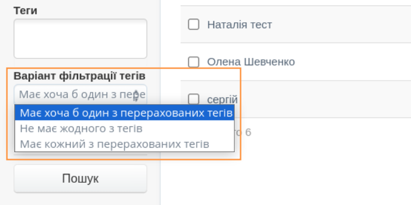 Під вікном Теги є доступні Варіанти фільтрації тегів. Можете вибрати такі опції як: