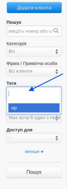 У списку клієнтів (можна перейти до нього, натиснувши вкладку "Клієнти" в верхньому меню системи) в панелі фільтрації є можливість пошуку за певними тегами. Після початку введення в полі "Теги" програма пропонує вже існуючі записи. У цьому полі також можна додати новий тег — механізм працює так само, як на картці клієнта.