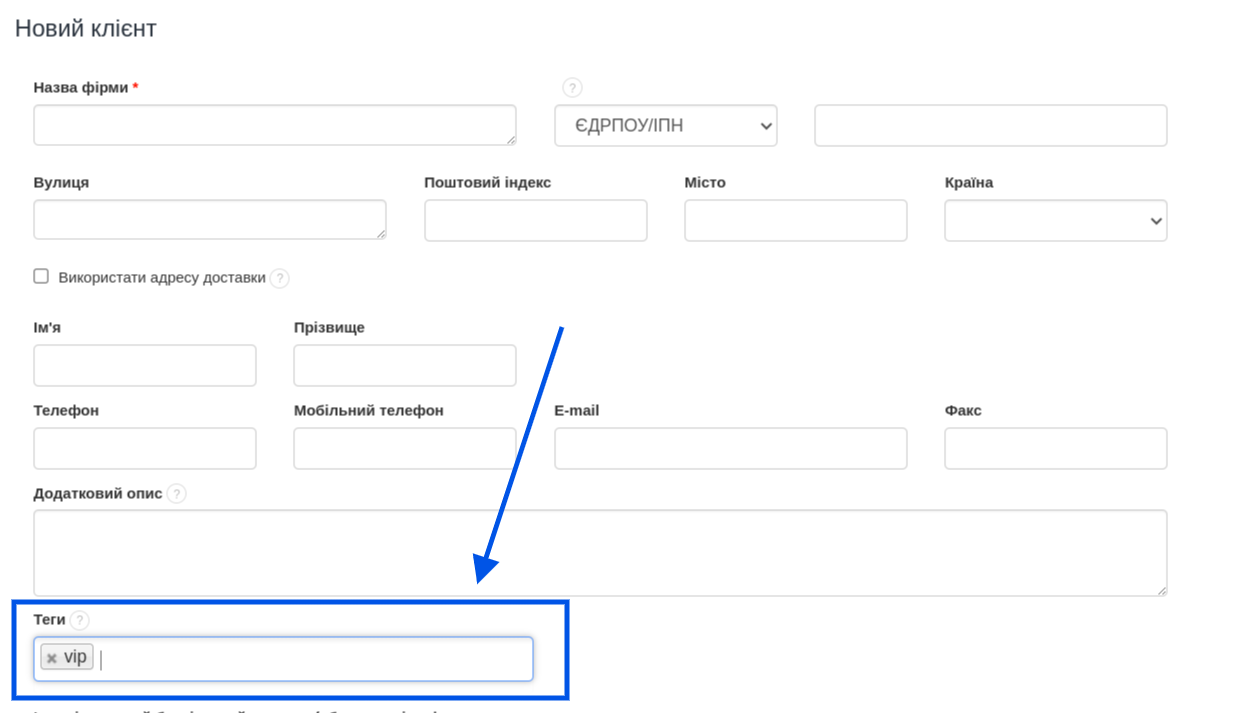 Коли ви знаходитесь на картці клієнта, у полі "Теги" введіть теги, якими хочете позначити цього клієнта.