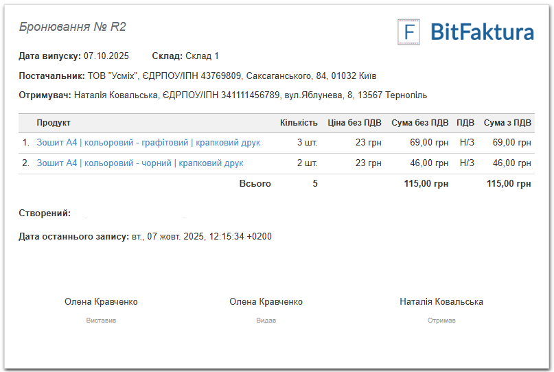 У системі з’явиться готовий документ бронювання товару або товарів, який відніме кількість продукції, зазначену в документі, зі складських залишків.